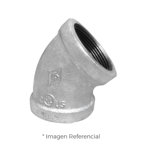 Es una solución confiable y duradera para una variedad de aplicaciones industriales. Con un ángulo de 45 grados, este producto está hecho de fierro maleable galvanizado ASTM A197 clase 150, lo que lo hace resistente a la corrosión y a las altas presiones.